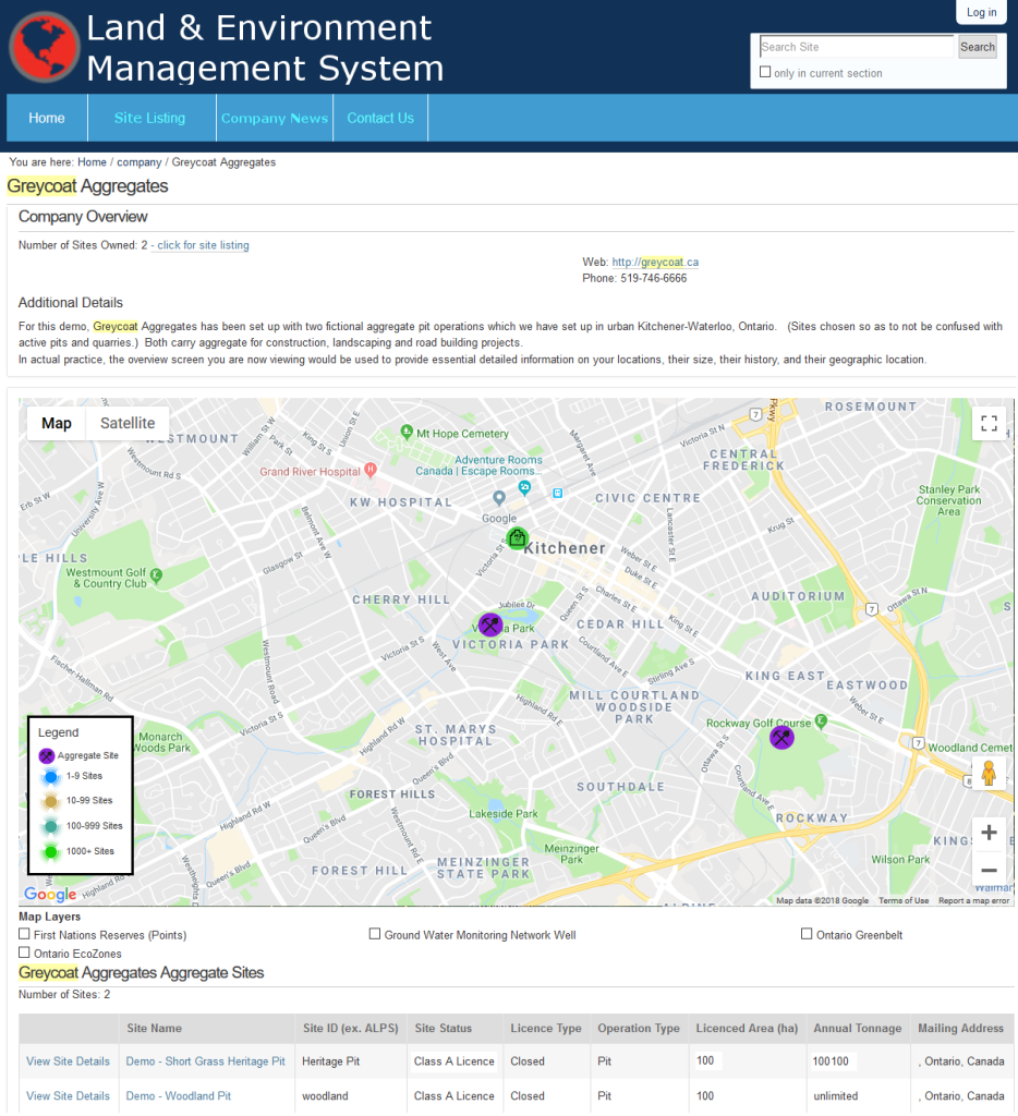 All company sites are both mapped and listed in a sortable table with a link to their individual pages, and a quick overview of site details.